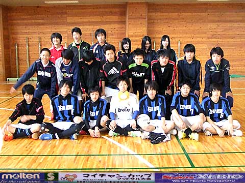 | 僕ら上田西フットサル班は1年生6人2年生6人3年生7人の総勢19人で、日々活動しています。 マイチャンカップの目標は優勝です。学年関係なくみんな、仲がいいチームです。 |